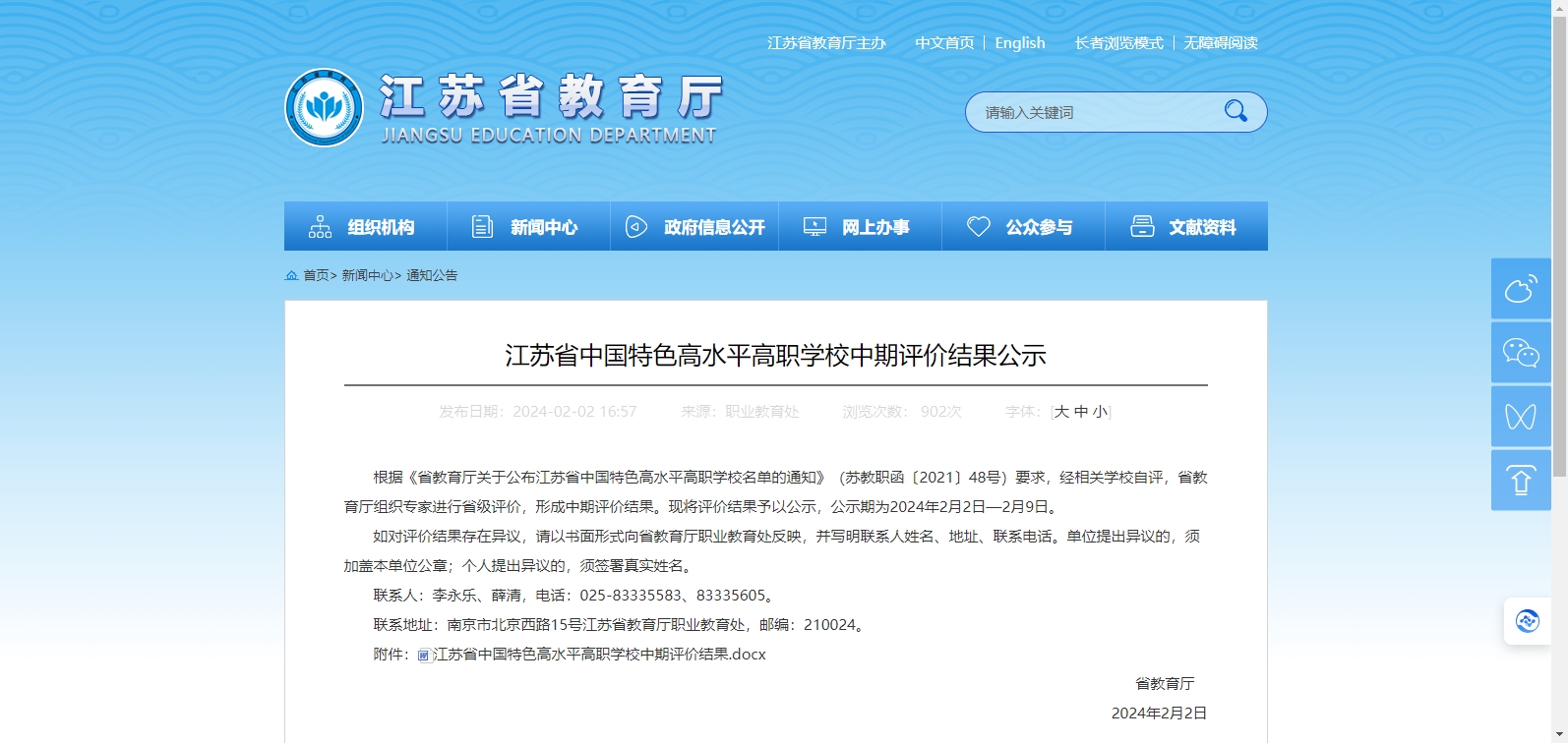 根據(jù)《省教育廳關(guān)于公布江蘇省中國特色高水平高職學(xué)校名單的通知》(蘇教職函〔2021〕48號)要求,經(jīng)相關(guān)學(xué)校自評,省教育廳組織專家進(jìn)行省級評價,形成中期評價結(jié)果?,F(xiàn)將評價結(jié)果予以公示,公示期為2024年2月2日—2月9日。