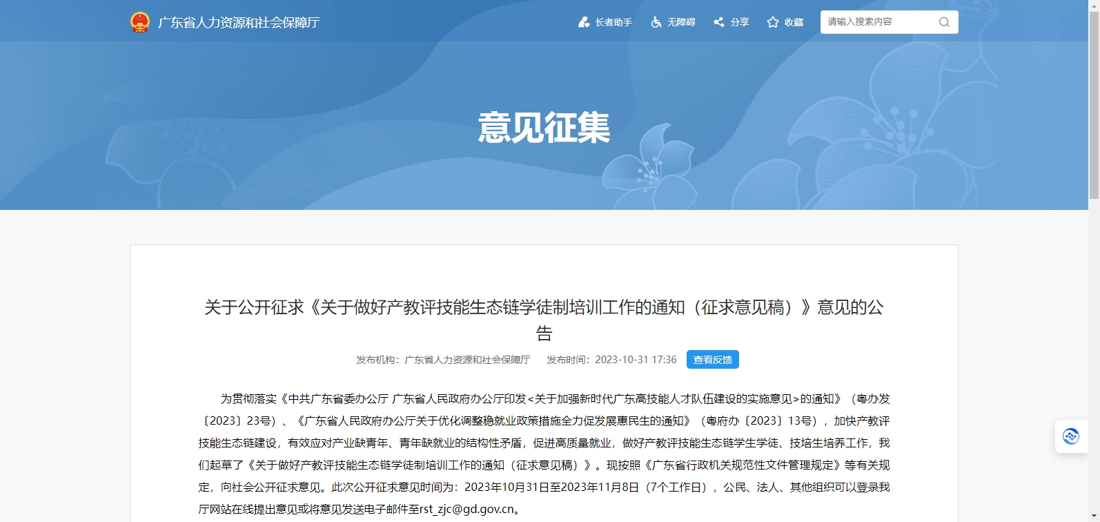 近日,廣東省人力資源和社會(huì)保障廳在其官網(wǎng)發(fā)布關(guān)于公開(kāi)征求《關(guān)于做好產(chǎn)教評(píng)技能生態(tài)鏈學(xué)徒制培訓(xùn)工作的通知(征求意見(jiàn)稿)》意見(jiàn)的公告,按照《廣東省行政機(jī)關(guān)規(guī)范性文件管理規(guī)定》等有關(guān)規(guī)定,向社會(huì)公開(kāi)征求意見(jiàn)......