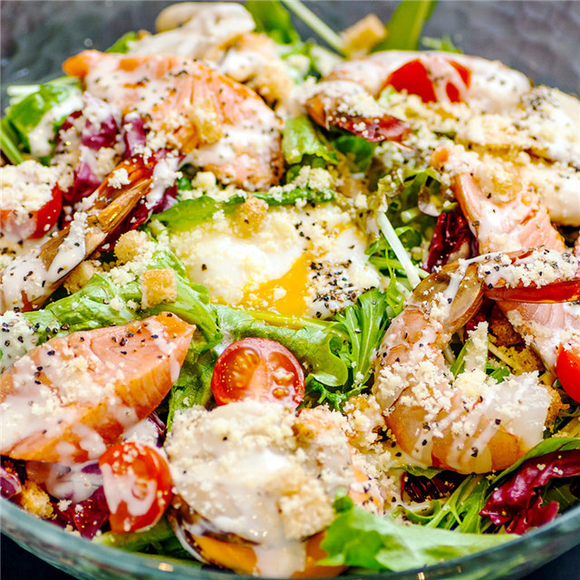 沙拉并不只是一堆冷冰冰的蔬菜,還可以包括各種高蛋白的肉類,以及面包丁、通心粉等主食。凱撒沙拉就是其中著名的一種,傳統(tǒng)風(fēng)味中除了蔬菜、肉類和奶酪外,還配有煎烤過的面包丁以提供飽腹感。 ......